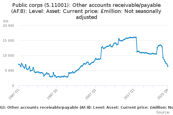 Download this time seriesPublic corps (S.11001): Other accounts receivable/payable (AF.8): Level: Asset: Current price: £million: Not seasonally adjusted