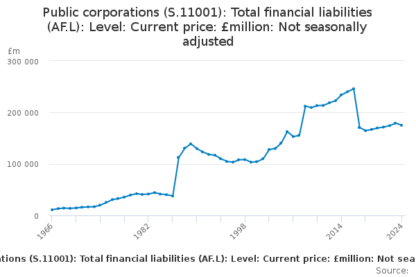 Download this time seriesPublic corporations (S.11001): Total financial liabilities (AF.L): Level: Current price: £million: Not seasonally adjusted