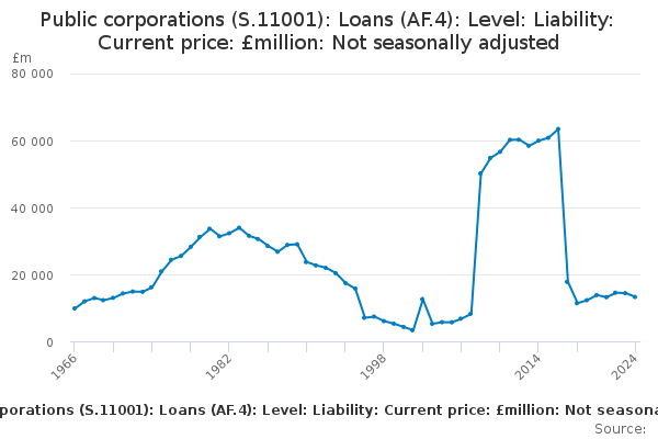 Download this time seriesPublic corporations (S.11001): Loans (AF.4): Level: Liability: Current price: £million: Not seasonally adjusted