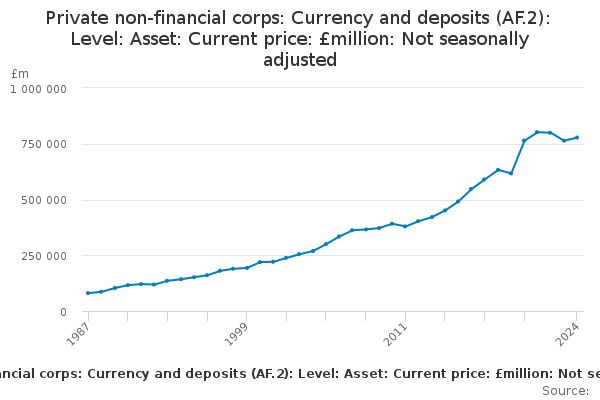 Download this time seriesPrivate non-financial corps: Currency and deposits (AF.2): Level: Asset: Current price: £million: Not seasonally adjusted
