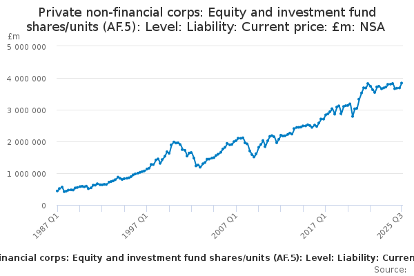 Download this time seriesPrivate non-financial corps: Equity and investment fund shares/units (AF.5): Level: Liability: Current price: £m: NSA