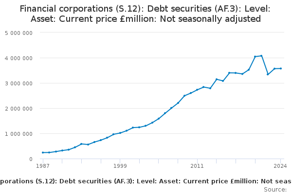 Download this time seriesFinancial corporations (S.12): Debt securities (AF.3): Level: Asset: Current price £million: Not seasonally adjusted