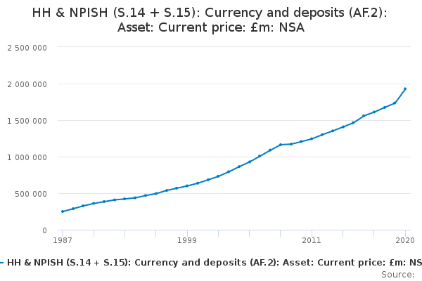 Download this time seriesHH & NPISH (S.14 + S.15): Currency and deposits (AF.2): Asset: Current price: £m: NSA