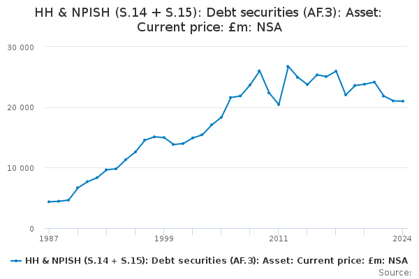Download this time seriesHH & NPISH (S.14 + S.15): Debt securities (AF.3): Asset: Current price: £m: NSA