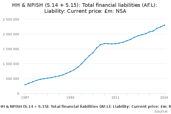 Download this time seriesHH & NPISH (S.14 + S.15): Total financial liabilities (AF.L): Liability: Current price: £m: NSA