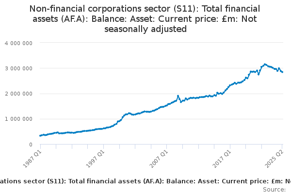Download this time seriesNon-financial corporations sector (S11): Total financial assets (AF.A): Balance: Asset: Current price: £m: Not seasonally adjusted