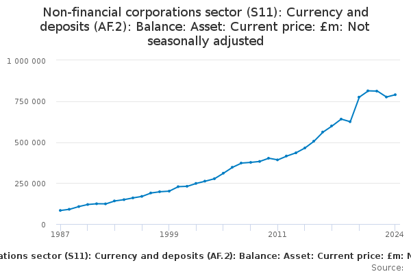 Download this time seriesNon-financial corporations sector (S11): Currency and deposits (AF.2): Balance: Asset: Current price: £m: Not seasonally adjusted