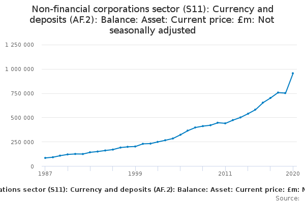 Download this time seriesNon-financial corporations sector (S11): Currency and deposits (AF.2): Balance: Asset: Current price: £m: Not seasonally adjusted
