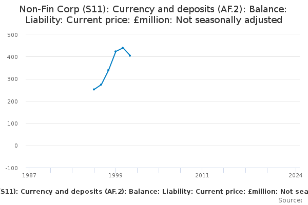 Download this time seriesNon-Fin Corp (S11): Currency and deposits (AF.2): Balance: Liability: Current price: £million: Not seasonally adjusted