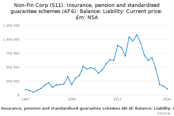 Download this time seriesNon-Fin Corp (S11): Insurance, pension and standardised guarantee schemes (AF.6): Balance: Liability: Current price: £m: NSA