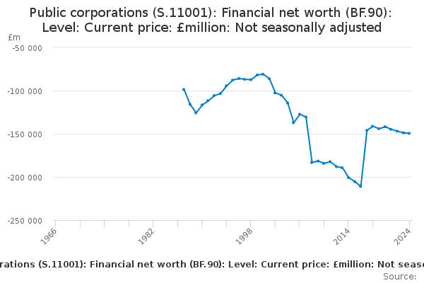 Download this time seriesPublic corporations (S.11001): Financial net worth (BF.90): Level: Current price: £million: Not seasonally adjusted