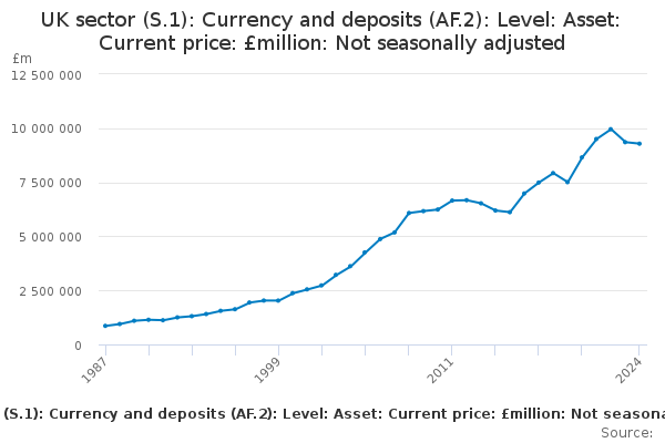 Download this time seriesUK sector (S.1): Currency and deposits (AF.2): Level: Asset: Current price: £million: Not seasonally adjusted