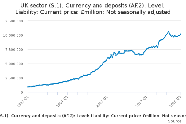 Download this time seriesUK sector (S.1): Currency and deposits (AF.2): Level: Liability: Current price: £million: Not seasonally adjusted