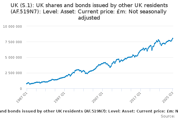 Download this time seriesUK (S.1): UK shares and bonds issued by other UK residents (AF.519N7): Level: Asset: Current price: £m: Not seasonally adjusted