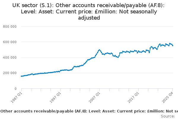 Download this time seriesUK sector (S.1): Other accounts receivable/payable (AF.8): Level: Asset: Current price: £million: Not seasonally adjusted