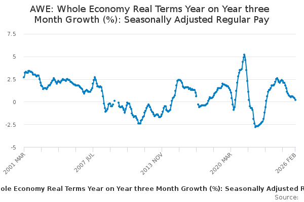 Download this time seriesAWE: Whole Economy Real Terms Year on Year three Month Growth (%): Seasonally Adjusted Regular Pay