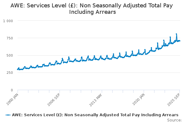 Download this time seriesAWE: Services Level (£): Non Seasonally Adjusted Total Pay Including Arrears