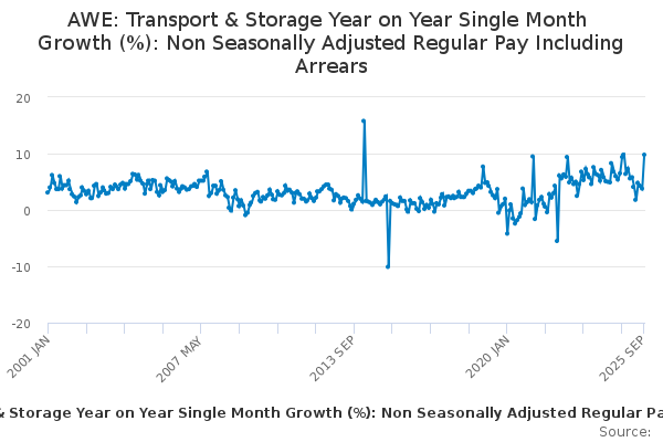 Download this time seriesAWE: Transport & Storage Year on Year Single Month Growth (%): Non Seasonally Adjusted Regular Pay Including Arrears