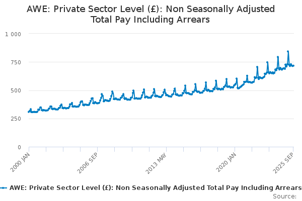 Download this time seriesAWE: Private Sector Level (£): Non Seasonally Adjusted Total Pay Including Arrears