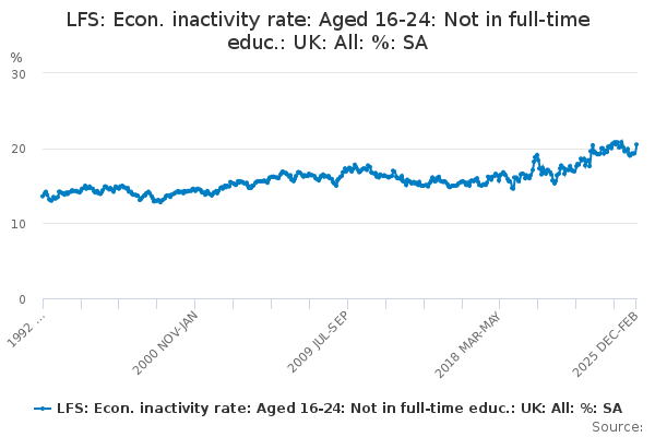 Download this time seriesLFS: Econ. inactivity rate: Aged 16-24: Not in full-time educ.: UK: All: %: SA
