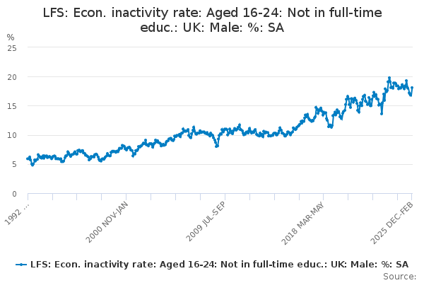 Download this time seriesLFS: Econ. inactivity rate: Aged 16-24: Not in full-time educ.: UK: Male: %: SA