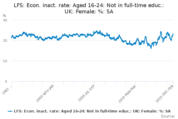 Download this time seriesLFS: Econ. inact. rate: Aged 16-24: Not in full-time educ.: UK: Female: %: SA
