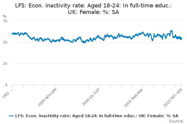 Download this time seriesLFS: Econ. inactivity rate: Aged 18-24: In full-time educ.: UK: Female: %: SA