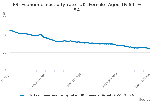 Download this time seriesLFS: Economic inactivity rate: UK: Female: Aged 16-64: %: SA