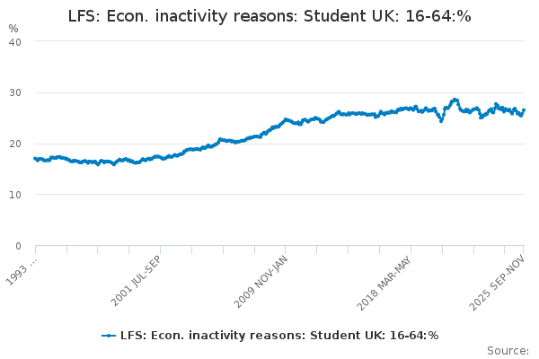 Download this time seriesLFS: Econ. inactivity reasons: Student UK: 16-64:%