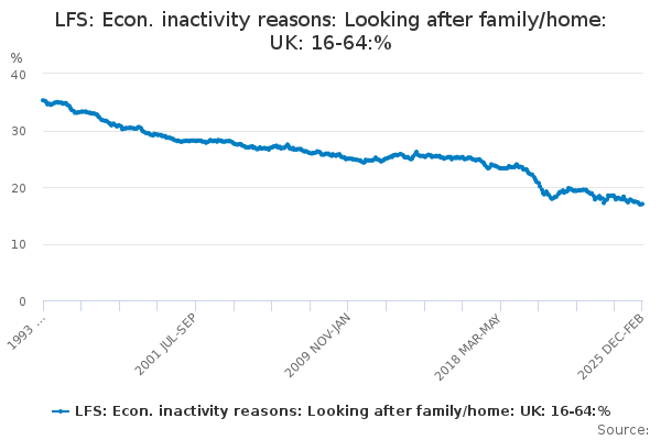 Download this time seriesLFS: Econ. inactivity reasons: Looking after family/home: UK: 16-64:%