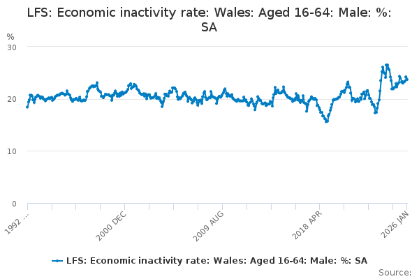 Download this time seriesLFS: Economic inactivity rate: Wales: Aged 16-64: Male: %: SA