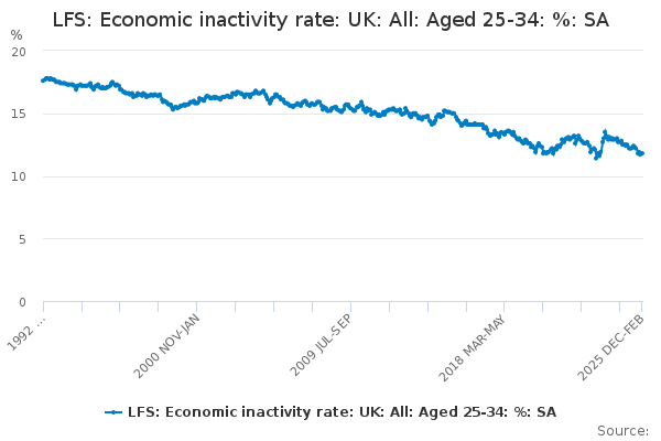 Download this time seriesLFS: Economic inactivity rate: UK: All: Aged 25-34: %: SA