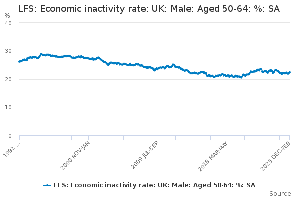 Download this time seriesLFS: Economic inactivity rate: UK: Male: Aged 50-64: %: SA