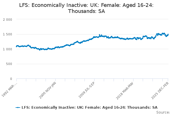 Download this time seriesLFS: Economically Inactive: UK: Female: Aged 16-24: Thousands: SA