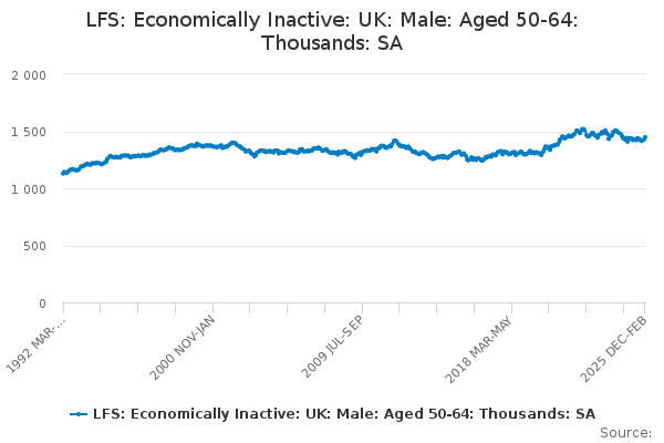 Download this time seriesLFS: Economically Inactive: UK: Male: Aged 50-64: Thousands: SA