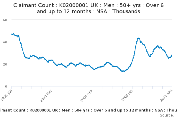 Download this time seriesClaimant Count : K02000001 UK : Men : 50+ yrs : Over 6 and up to 12 months : NSA : Thousands