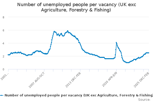 Download this time seriesNumber of unemployed people per vacancy (UK exc Agriculture, Forestry & Fishing)