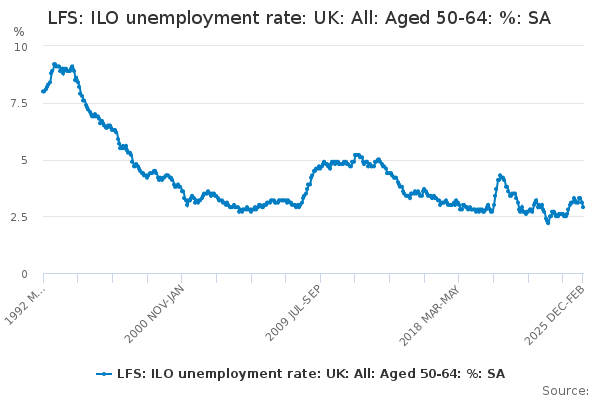 Download this time seriesLFS: ILO unemployment rate: UK: All: Aged 50-64: %: SA