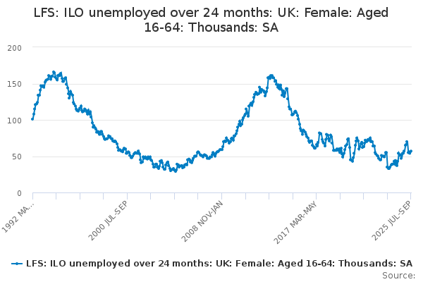 Download this time seriesLFS: ILO unemployed over 24 months: UK: Female: Aged 16-64: Thousands: SA