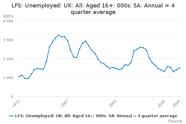 Download this time seriesLFS: Unemployed: UK: All: Aged 16+: 000s: SA: Annual = 4 quarter average