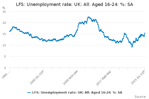 Download this time seriesLFS: Unemployment rate: UK: All: Aged 16-24: %: SA