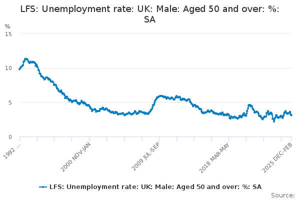 Download this time seriesLFS: Unemployment rate: UK: Male: Aged 50 and over: %: SA