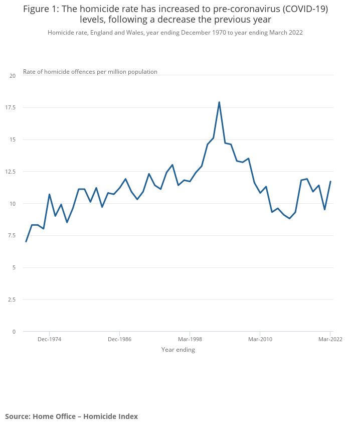 Homicide rate, England and Wales, year ending December 1970 to year ending March 2022
