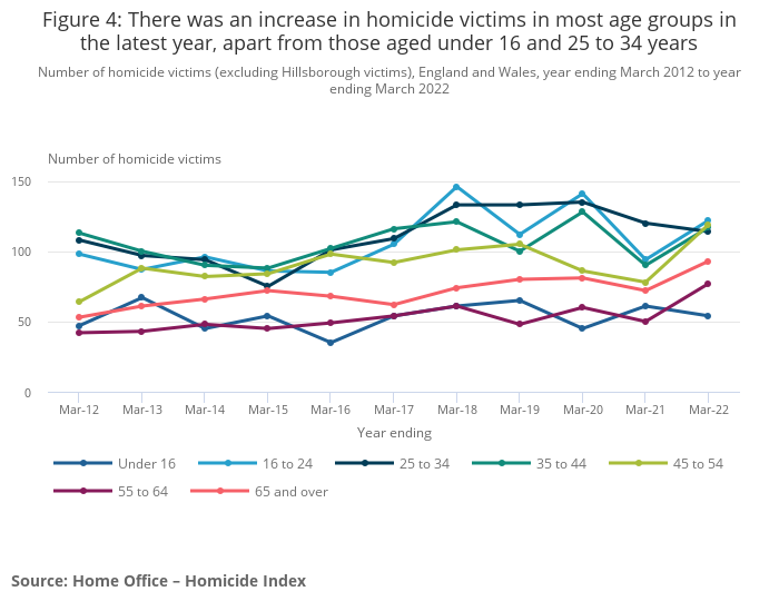 The most common age group for victims of homicides recorded in the year ending March 2022 was those aged 16 to 24 years (122 victims) (Figure 4).