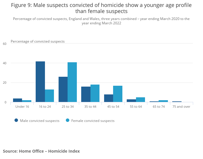 Figure 9: Male suspects convicted of homicide show a younger age profile than female suspects