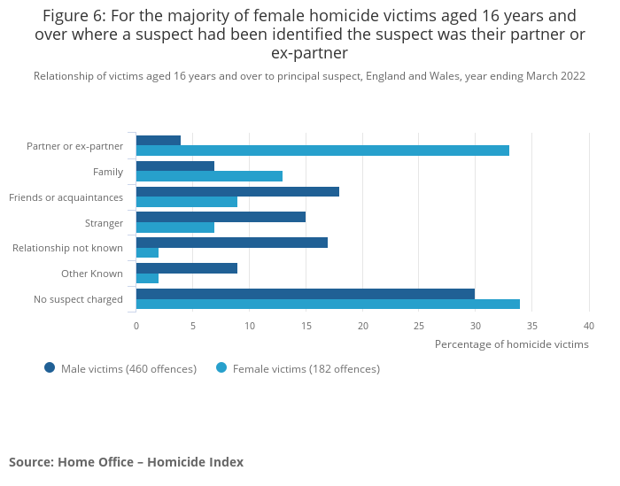 There were large differences in the profile of victim-suspect relationships between male and female victims aged 16 years and over. In the year ending March 2022, female victims were more commonly killed by a partner or ex-partner (33%) or a family member (13%). For males the suspected killer was more commonly a friend or acquaintance (18%), stranger (15%) or other known person (9%).