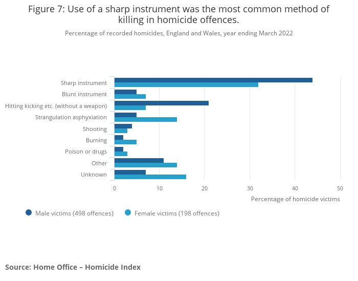 As in previous years, the most common method of killing, for both male and female victims, was by a sharp instrument (including knives; 41%). Over the last decade, the proportion of homicide offences committed by a sharp instrument has fluctuated between 36% and 42%, (the proportion was 36% in the year ending March 2017 if the Hillsborough manslaughters are excluded).