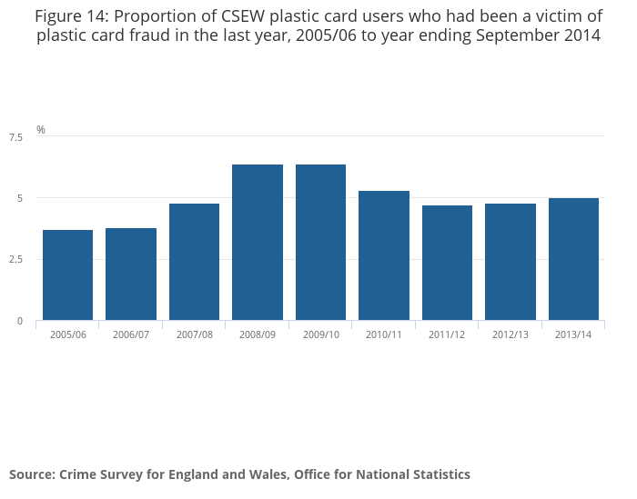 After identifying an error in published tables a minor revision has been made to this release. The error related to data on the proportion of people who have been victims of plastic card fraud for the last two years in the time series (Oct-12 to Sep-13 and Oct-13 to Sep-14). Revisions have been made to figure 14 in the statistical bulletin (also contained in reference table 01. Bulletin Tables - Crime in England and Wales, Year Ending September 2014) and to the short story: A stocktake of crime statistics in England and Wales.