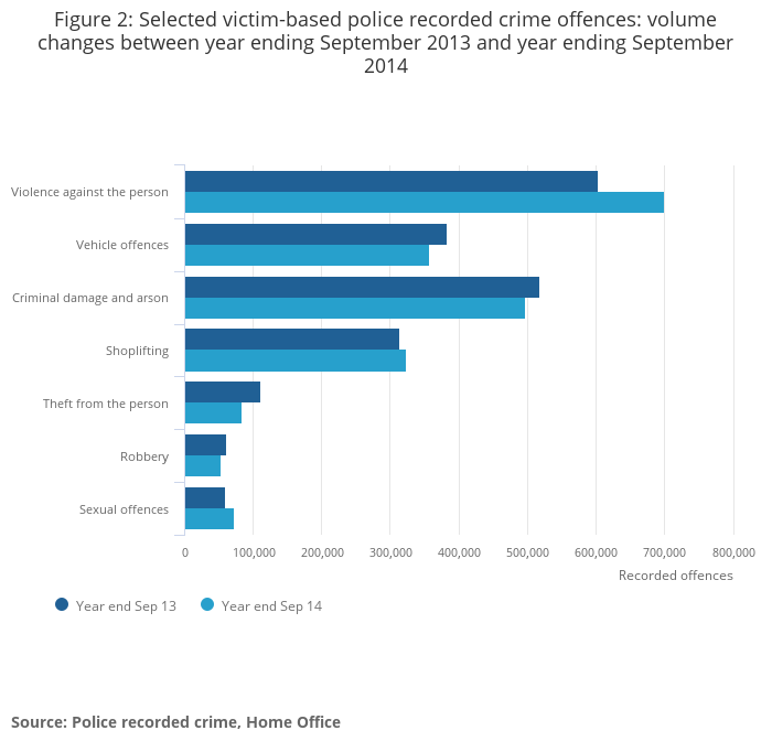 Victim-based crime5 accounted for 84% of all police recorded crime and fell by 1% in the year ending September 2014 compared with the previous year, with 3.1 million offences recorded. Within victim-based crime, there were decreases across most of the police recorded crime categories. The notable exceptions to this were violence against the person, which was up by 16% (an additional 96,000 offences), sexual offences up by 22% (13,000 offences) and shoplifting up by 3% (9,000 offences).