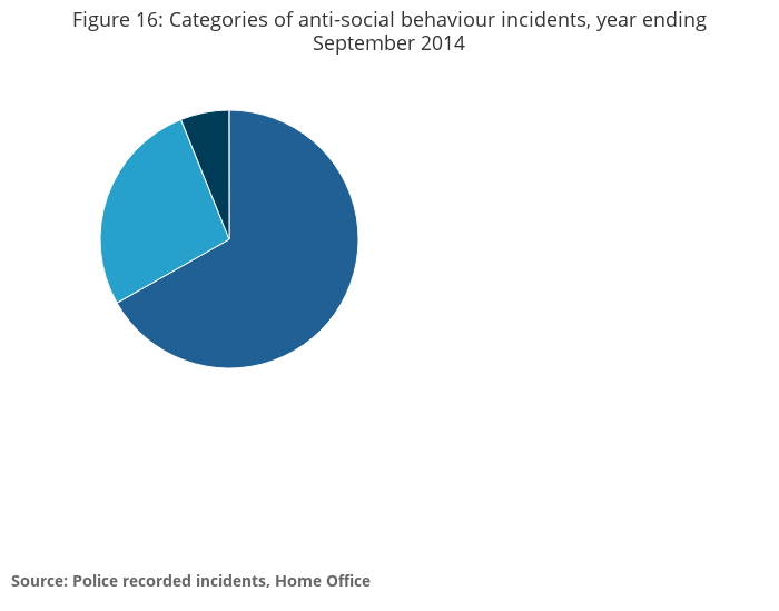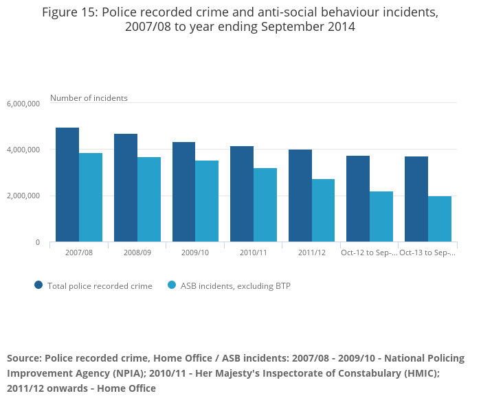 Around 2.0 million incidents of anti-social behaviour (ASB) were recorded by the police for the year ending September 2014. These are incidents which were not judged to require recording as a notifiable offence within the Home Office Counting Rules for recorded crime. The number of ASB incidents in the year ending September 2014 decreased by 10% compared with the previous year. However, it should be noted that a review by Her Majesty’s Inspectorate of Constabulary (HMIC, 2012) found that there was a wide variation in the quality of decision making associated with the recording of ASB. As a result, ASB incident data should be interpreted with caution.